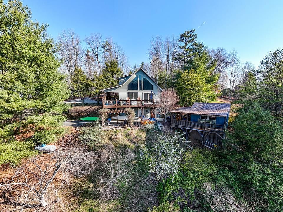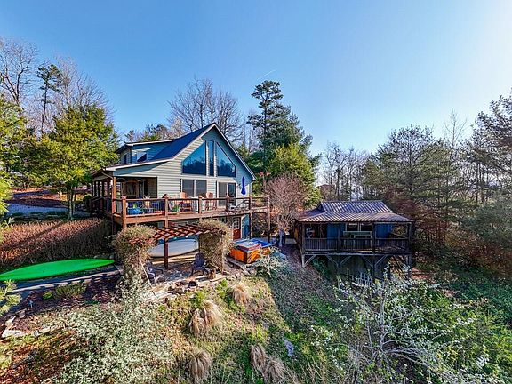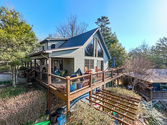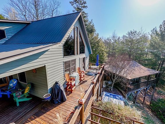 Mountain Retreat with amazing views and beautiful landscaping! This 3-level mountain chalet in Murphy is everything you would look for in a mountain home. Enough privacy but only 15 minutes from Murphy, 20 minutes to Blairsville. As you enter the home from the wrap around deck you will love the open floor plan which showcases a cheery updated kitchen with large island, dual fuel range with convection oven and large pantry! Living/great room features gas fireplace, wood ceilings and refinished floor, newer large bank of picture windows with southern exposure letting in the winter sunlight but not exposing the home to excessive heat in the summer months. Main floor also includes a bedroom and full bath. Upstairs you will find the master loft bedroom with ensuite bath and fantastic view of the mountain landscape. As you head downstairs you find a walkout basement with a third full bath along with extra sleeping quarters/family or TV room. Also downstairs is located the washer/dryer area along with a workshop and storage area. Just outside you will find a hot tub and fire pit area to enjoy all year round. Also located here is a detached annex currently being used as a game room (think man cave/bar area) with another covered deck area and additional storage underneath. There are 3 parking areas with this home which is located in a great mountain community with all paved roads! Offered with most furnishings (please request exclusions list).