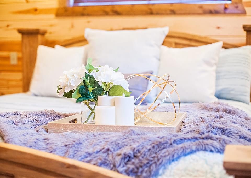 Spacious cabinHot tubFire pitBeautiful wooded viewsSpa-inspired bathroomRustic charmDouble vanities