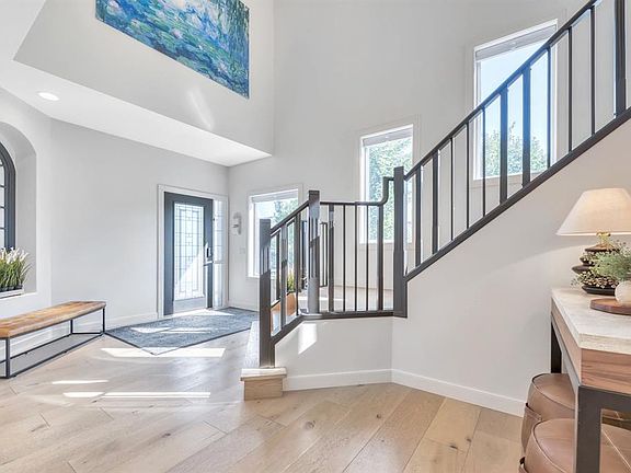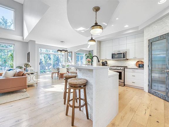 Welcome to this stunning custom designed home in the prestigious Estates of Cranston, siding onto green space and play park, surrounded by mature trees and walking distance to the picturesque ridge. From the moment you arrive, the impressive stone exterior and meticulously landscaped yard set the tone for what’s inside. Step through the front door into a bright, airy foyer with soaring ceilings and a dramatic staircase that immediately draws you in. The open-concept main floor is bathed in natural light from oversized windows, showcasing beautiful wide-plank white oak hardwood floors and thoughtful designer touches throughout. The spacious great room features a modern chandelier, large picture windows with serene backyard views, and a warm yet contemporary design perfect for both relaxing and entertaining. The dining area flows seamlessly into the stylish kitchen and cozy breakfast/study/reading nook, step out to the backyard for easy indoor-outdoor living. Additionally, the main floor offers a full bedroom and a full bath—ideal for generational living, guests or a home business. This home also offers the option to be accessible on the main floor - can offer a wheelchair lift from the garage to the main. The beautiful kitchen offers a curved island for people to gather around, gorgeous finishes, newer Kitchenaid appliances (with extended warranty) and a walk-through pantry from the triple heated garage (with double drive door and INDOOR HOT TUB to relax), seamlessly connecting to the dining and living areas. The lighting selections offered in the home is a true DELIGHT! Upstairs, you’ll find two spacious bedrooms, a full bath, and a massive primary oasis highlighted by a brick feature wall - industrial yet warm and an enclave vaulted dormer. The luxurious ensuite offers a spa-like experience with dual vanities, soaker tub, oversized shower, and a 21’ long walk-in closet with another vaulted dormer. There is definitely not a lack of storage in this home! The finished basement is a true showpiece with a stunning nightfall starry ceiling light feature, large recreation theatre room with projector and power screen, wet bar, home gym (easily converted back to a bedroom), den, additional bedroom, and full bath. So much space for all the activities! Peace of mind is paramount with a newer furnace (1 of 2) and hot water tank as is having summer comfort with Central Air (2 units). Outside, the backyard is a private oasis with lush landscaping, mature trees, and access to nearby walking paths and parks. On the side of the house there is a beautiful courtyard type space to enjoy the sun rise and watch your kids play in the park next to your home. With its prime location, functional design, and high-end renovations, this home delivers the perfect balance of elegance, style and comfort in one of Calgary’s most sought-after communities.