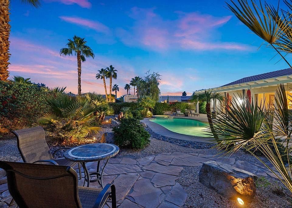 IMMACULATE TURNKEY FURNISHED HOME IN THE SMALL GATED COMMUNITY OF TUCSON - LOW HOA'S & FANTASTIC LOCATION - CLOSE PROXIMITY TO THE INDIAN WELLS TENNIS GARDENS. Step through striking wood entry doors and feel immediately drawn to views of the fabulous backyard framed with tall palms and lush landscaping. Pick your favorite spot to enjoy your surroundings; next to the inviting pool and spa, around the warmth of the fire pit, or under the expansive covered patio. The depth and beauty of the outdoor space are exceptional. The casually elegant and open-concept great room features a corner fireplace and a bar area. High ceilings and dual sliders showcase the view and let in an abundance of light. Limestone floors and baseboards add a gracious feel to the rooms. Bullnose granite countertops and a sit-down breakfast bar are featured in the kitchen. The master suite, with rich wood flooring, opens to the pool patio. The master bath has been beautifully remodeled in a contemporary palette of grey and white. Two comfortable guest bedrooms have brand new carpeting and the hall bath has been updated in neutral tones. Located on an interior corner lot, this home offers plenty of privacy and tranquility. The southwest-inspired architectural style of the residences and the pride of ownership shown throughout the community make Tucson a very special find!
