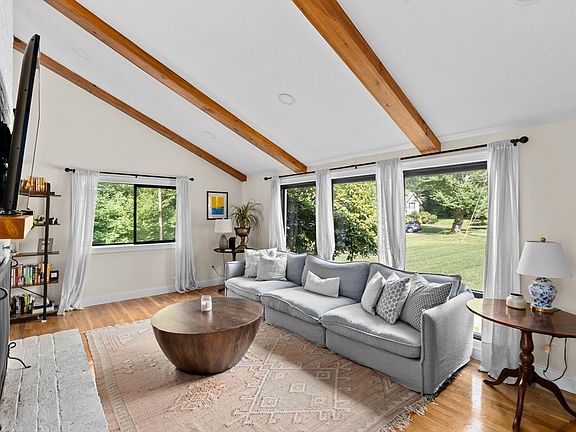 Experience modern living in this beautifully renovated 4-bedroom, 2.5-bathroom contemporary ranch, complete with a 2-car garage, nestled at the end of a serene cul-de-sac. Renovated in 2021, this residence breaks the mold of traditional ranch designs with its impressive vaulted ceilings, adorned with stylish beams and shiplap for a chic, open ambiance. The kitchen is a showstopper, featuring sleek white cabinetry and elegant quartz countertops, flowing effortlessly into the dining area and a sun-drenched family room with a cozy fireplace. The main level hosts 3 bedrooms and 2 bathrooms, including a luxurious master suite with its own private bath and deck. The versatile lower level, mostly above grade, offers a wealth of additional space, including a 4th bedroom, half bath, family room with a fireplace, mudroom, and a bonus room. Outside, relish in the tranquility of your private backyard, bordered by woods for added privacy, and enjoy the expansive, level front lawn.