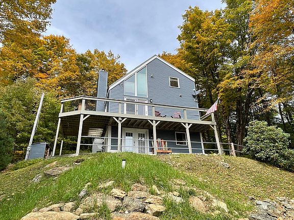 Charming chalet nestled in the Chimney Hill Development not far from the village of Wilmington, Lake Whitingham and Mount Snow ski resort. This private chalet sits up on the hill with wonderful views overlooking the ridgeline to the south, spacious wraparound deck on the front of the house to gather and BBQue or enjoy private gatherings on the rear covered porch around the propane fire pit, the perfect spot to enjoy a glass of wine. The interior is warm and inviting, features open concept living with vaulted ceiling, cedar walls, woodstove, bedroom, laundry area, half bath on main level, two bedrooms, full bath up and two bedrooms, full bath and family room on the entry level. Renovated from top to bottom over the past several years; metal roof, vinyl siding with vapor barrier, windows, flooring, carpeting, bathroom fixtures, appliances, on-demand hot water, exterior decking and railings, renovated entry level with wet bar and gas stove provides another great gathering space. Chimney Hill amenities include clubhouse with indoor and outdoor pools, hot tub, saunas, workout room, community gathering spaces, tennis courts, CHOA trail system for hiking and snowmobiling, and ice skating rink with warming hut. This is the perfect four season retreat. Great rental history. Being sold fully furnished including firewood!