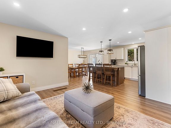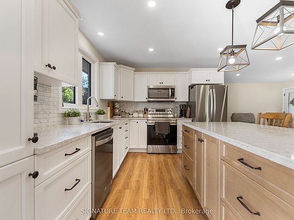 Clean and elegant kitchenNewer appliancesQuartz countertopsOpen concept layoutFinished basementWood stoveLaundry room