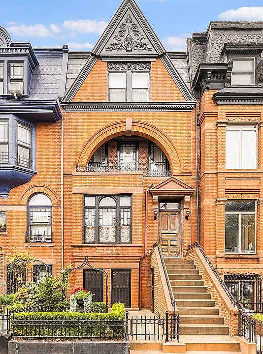 This historic home is one of Park Slope’s earliest and most beautiful Queen Anne townhouses and displays all the hallmarks of the style: the Romanesque arches, the massing of shapes and forms, as well as the use of different sized windows, loggias, ornamental cast iron and pressed metal, and terra-cotta and stained glass. The varying rooflines, dormers, oriels and hooded window frames are delightful.