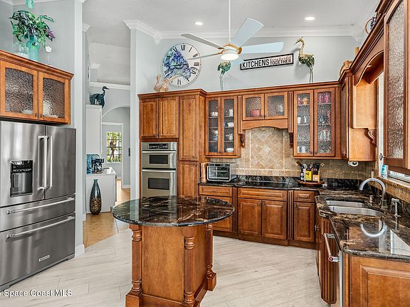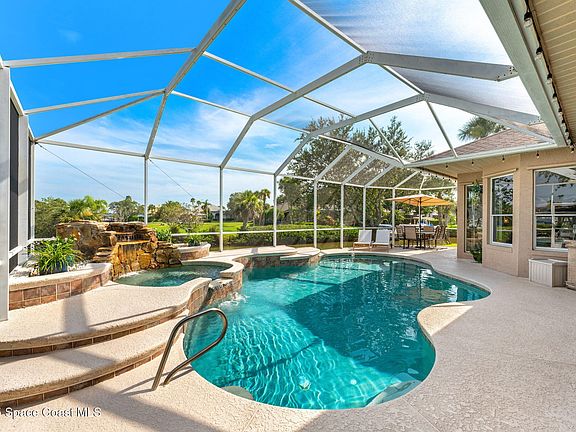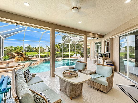 Priced $55K below appraisal! Enjoy rocket launches, dolphins, and manatees from this rare ½-acre point-lot on a deep saltwater canal with wide water views and a newer 10K lb covered boat lift. Professional landscaping greets you, and inside, cathedral ceilings and triple sliders showcase stunning water views. Fully renovated, the home boasts a new roof (2025), new AC, updated floors, quartz wet bar with nugget ice maker, bar fridge, remodeled baths, water purification, irrigation, and fresh paint. The chef's kitchen offers granite counters, new dishwasher and fridge, plus an outdoor kitchen for BBQs by the heated pool. An executive office with vaulted ceilings and garden views sits at the center of the home. The owner's suite feels like a spa with water views and a 2-person bath. Wheelchair-friendly design ensures barrier-free living from front door to dock—your perfect saltwater sanctuary. See Feature Sheet under Documents tab.
