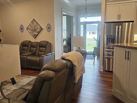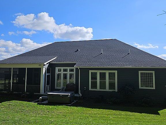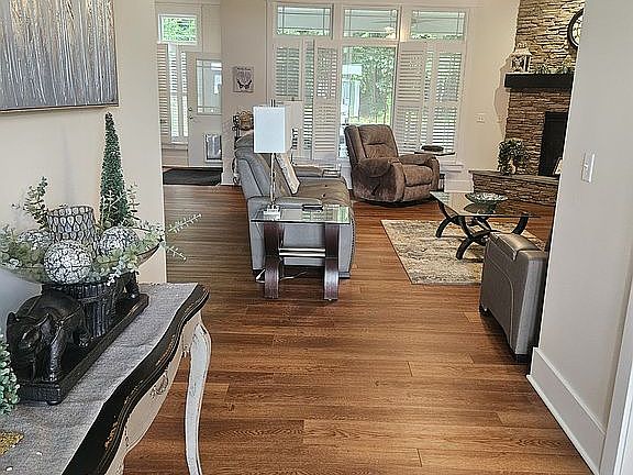 Beautiful home on golf course separated by patch of woods for privacy. 2500 Sq .ft. on crawl space, oversized 800 sq. ft. garage also wired for 220 , handicapped accessible, luxury vinyl plank flooring waterproof 50 yr warranty, heat pump with central air, formal dining room, living room, eat in area, kitchen with granite counter tops, all appliances with microwave drawer, slide out cabinet drawers and pantry. Master bedroom bath with heated floors, with wider shower for wheelchair access, tons of cabinet space, 2 walk-in closets, both bathrooms have ceramic tile, laundry room with washer/dryer included, large coat/shoe closet just inside from garage. Back has screened in porch, Bull Frog hot tub conveys, leafguard on gutters. Lots of storage in closet in garage, room to part truck, mower and 2 small cars in garage