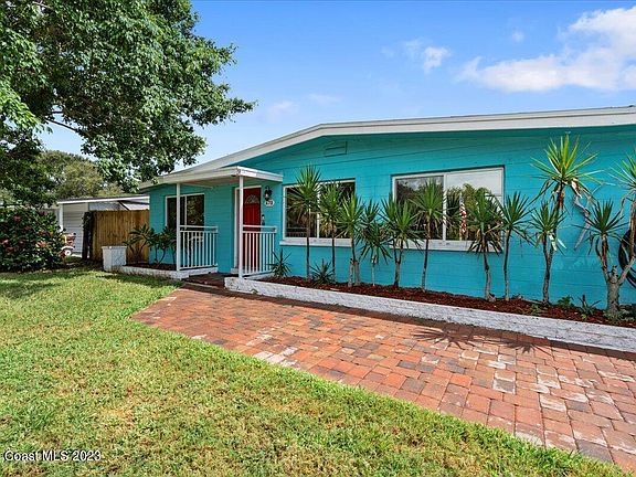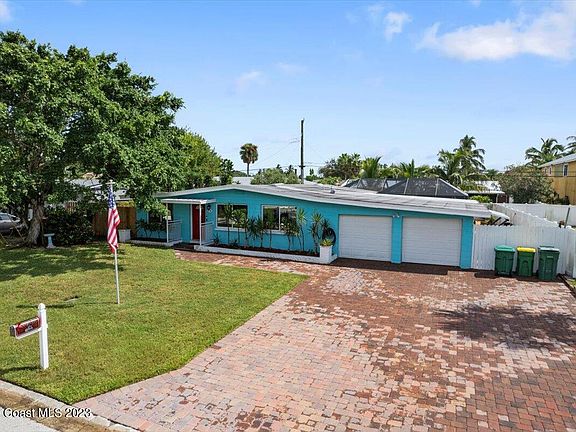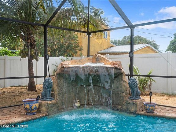 Price Reduced and Back on the Market! Buyer Financing Fell Through. Their loss is your gain! Last chance to own paradise! Five minute walk to the ocean and four blocks away from downtown Cocoa Beach, this Atlantic coastline dream home boasts a 2019 heated pool and inground spa with waterfall feature welcoming you to unwind. Endless upgrades including 2018 remodeled kitchen complete with granite countertops, glass tile backsplash, soft close drawers, and Whirlpool stainless steel appliances; 2022 Rheem hot water heater; 2019 HVAC; 2019 electric panel; 2023 reroofed Tiki Hut; 2017 upgraded master and guest bathroom; a 420 sq ft garage split unit added under air in 2019; an oversized, paved 6 car driveway with ample parking for a boat or an RV; as well as 2023 8' X 10' ALL aluminum shed. For the Florida plantsman: three mature coconut trees, an avocado tree, and an olive tree await.