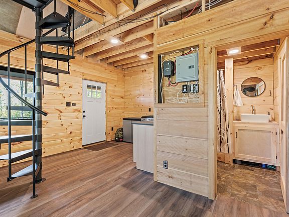The full bathroom blends rustic charm with practical amenities, featuring a shower and composting toilet. A handcrafted spiral staircase leads to two cozy lofts, offering inviting spaces to rest after a day in the woods or mountains. Outside, a large wraparound deck provides the perfect spot to sip your morning coffee, stargaze at night, or simply take in the sweeping mountain views. Sustainable features include solar panels, insulated walls, a water cistern system, composting septic, and a generator hookup, ensuring comfort and peace of mind while enjoying life off the grid. Wildlife sightings are frequent, with deer, moose, and more often passing through the property.