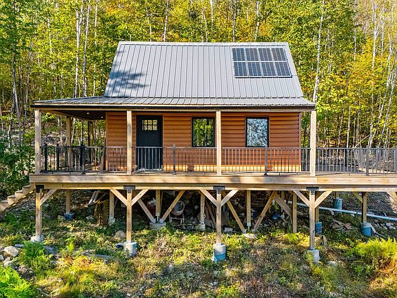 Welcome to your private Maine retreat in Brownfield! Set on 14 acres of untouched land, this off-grid cabin offers the peace and seclusion of the Maine woods with breathtaking views of both the Maine and New Hampshire mountains. Built in 2021, it captures the rustic charm of a classic Maine ''camp'' while offering modern upgrades rarely found in off-grid living. Step inside and you'll be greeted by warm wood interiors, vaulted ceilings, and picture windows that frame the surrounding forest and mountains. The open-concept layout includes a beautifully upgraded kitchen with stainless steel appliances, a gas stove, and a refrigerator. The spacious living area centers around a striking Jøtul fireplace, creating a cozy year-round retreat.