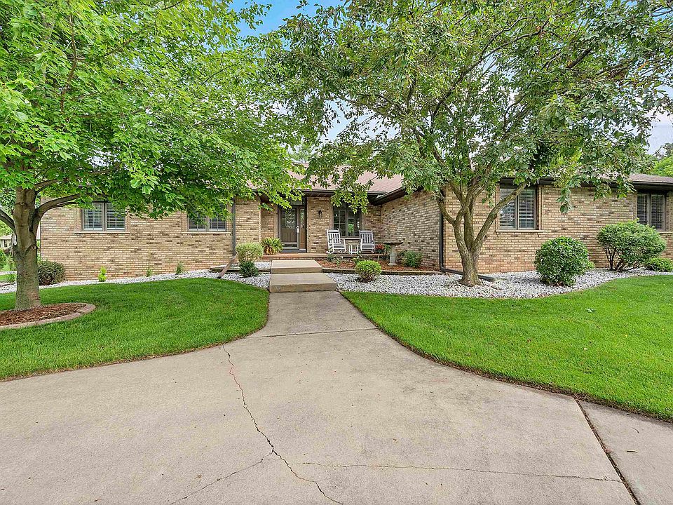 Nestled on a serene 1.32-acre cul-de-sac, this sprawling all-brick ranch offers 4 bedrooms of refined living. A circle drive welcomes you to timeless comfort and sophistication. The grand living room features a two-way gas fireplace, hardwood floors, built-ins, and oversized windows with backyard views. The chef’s kitchen boasts center island, tile flooring, stainless appliances, and a wet bar with wine racks. The expansive primary suite includes a fireplace, tray ceiling, patio access, walk-in closet, and spa-like bath with walk-in tile shower and double vanity. The finished lower level is an entertainer’s dream with egress windows, family room, bar, golf simulator, gym, and full bath. The 3.5-car heated garage includes a workbench and lower-level access. Must see home!