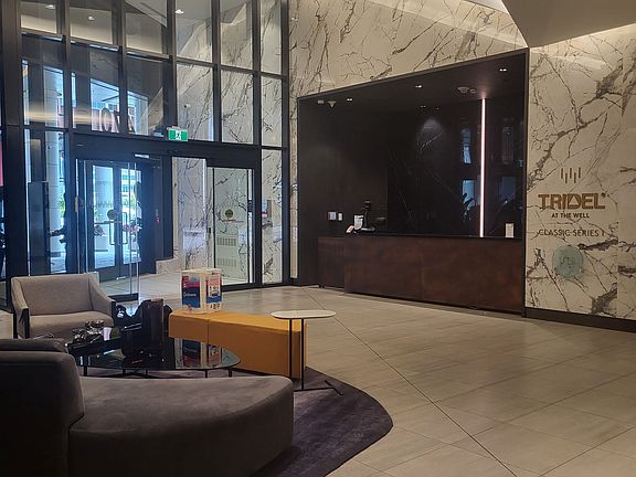 This spacious 2 bedroom + den, 2-bath suite is located at "The Well," Tridel's most dynamic new urban village in the heart of Toronto. Offering 946 sq ft of bright, open-concept living, the unit features breathtaking, unobstructed west-facing views of the city skyline and Lake Ontario. A private balcony extends from the living room, complemented by 10-foot ceilings, modern finishes, soft-close cabinetry, quartz countertops and backsplash, built-in appliances, and a full-size stacked washer and dryer. Included with the suite are a dedicated parking space and locker. Both bedrooms offer comfortable sleeping space, with the primary bedroom featuring two double mirrored closets and a luxurious 6-piece ensuite bathroom. There's also a versatile den, perfect for a home office, study, or reading nook. Residents enjoy access to world-class amenities, including a rooftop pool and sundeck, BBQ terrace, state-of-the-art fitness and yoga studios, lounges, business suites, guest rooms, a dog run, and 24/7 concierge and security. Situated within "The Well"-an architectural landmark with over 30,000 sq ft of indoor and outdoor retail-this location offers boutique shopping, dining, entertainment, markets, and direct access to the Wellington Food Hall. With unparalleled walkability to the CN Tower, PATH, waterfront, Rogers Centre, TTC, and both the entertainment and financial districts, this is downtown living at its finest. Live-Eat-Shop-Work-Play, at TRIDEL, at The Well