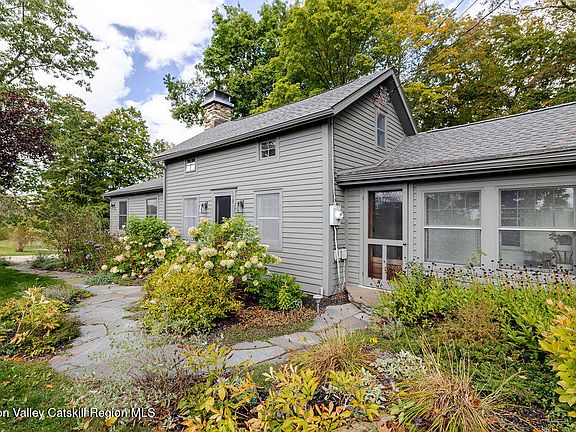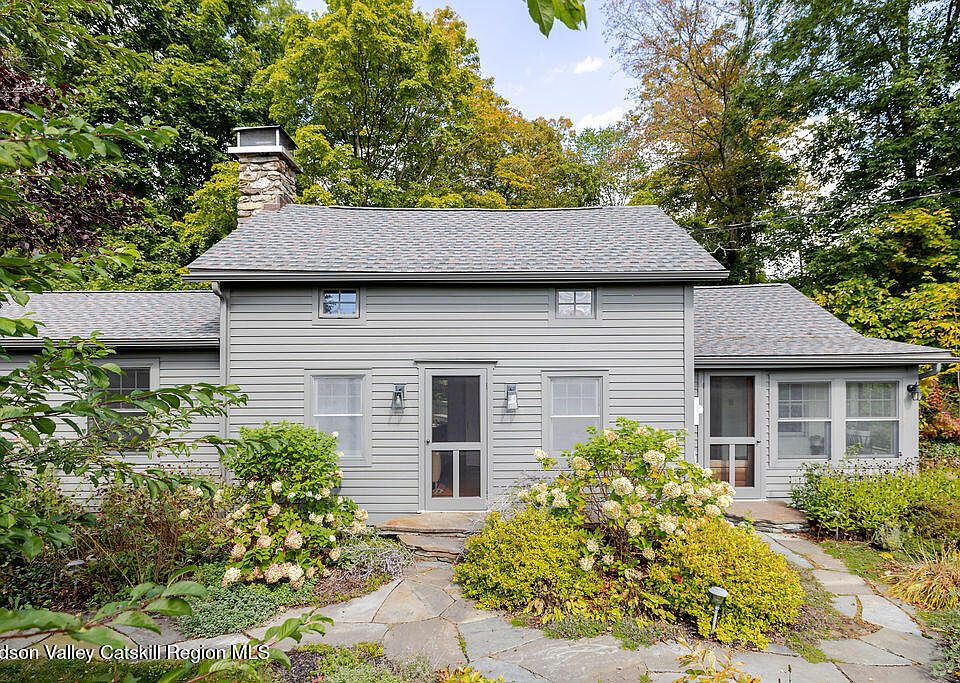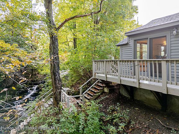 CHASING WATERFALLS. This quaint historic eyebrow colonial backs up to a year-round rushing waterfall on a lightly traveled winding country road. The first floor of this home has a living room with a wood-burning fireplace, a country kitchen which opens to a dining area, guest bedroom/den with an office alcove, full bath, mud-room, and a spacious primary suite with its own full bath. There is a large deck accessed by both bedrooms and the dining area which runs the length of the house and overlooks the waterfall. Open the glass sliders and listen to the unending symphony of the water. Upstairs, is an enchanting guest bedroom with a sitting area and its own full bath. Beautiful wide-board wood floors throughout the house. The house is sited on more than an acre with open lawn and lovely cottage gardens. Splendid, sunny views of a tree farm across the road. There is a separate heated studio building with skylights. Perfect for the artist or as a home office. Nothing like this on the market. Conveniently located between Hudson, New York and Great Barrington, Massachusetts.