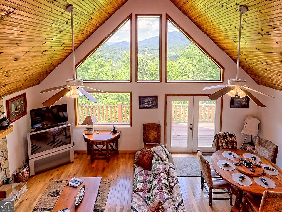Welcome to this stunning chalet nestled in a private location with spectacular views from every level! The open floor plan and large porch is perfect for entertaining and enjoying the breathtaking scenery! High wood ceilings and fireplace add a touch of warmth to the space, creating a cozy ambiance for those chilly evenings. Bedroom on the main with walk in closet, full bath and the convenience of having the laundry on the main! Upstairs, the master awaits, complete with a full bath and a generously sized walk-in closet. Whether you're looking to create a game room or cozy den, the full basement has the flexibility to suit your needs! Room in basement being used as 3rd bedroom and is perfect for accommodating guests or can be used as storage! Indulge in relaxation as you soak in the hot tub taking in the views surrounding you. 2nd driveway downstairs so there is no shortage of space for you and your guests!!