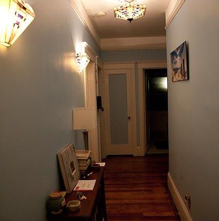 The entry area also has custom paint; tiffany sconces and matching ceiling fixture and hardwood floors.