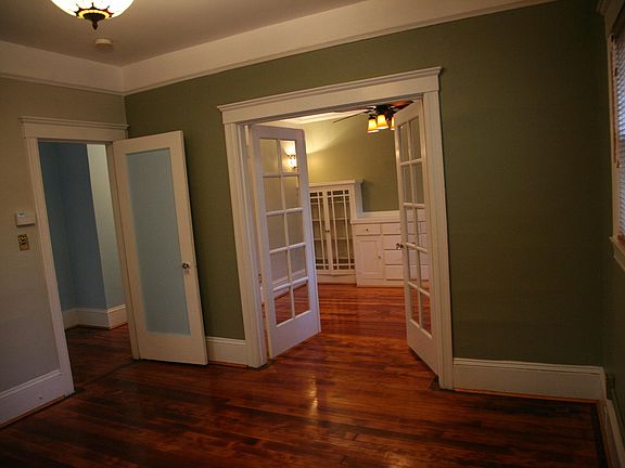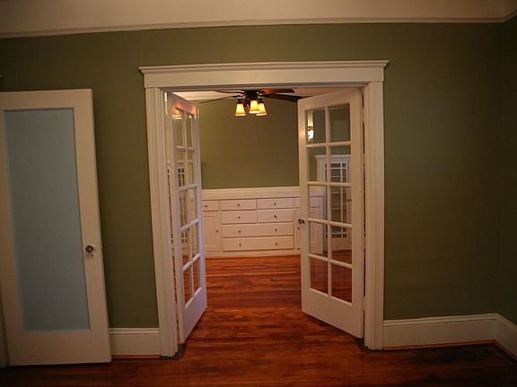 The living room has custom paint; a ceiling fan; built in glass cabinets from 1922; hardwood floors custom window coverings and tiffany sconces. It is separated from the bedroom by French doors.