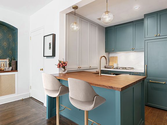 The kitchen has been outfitted with top appliances such as the Bertazzoni built-in range, Bosch dishwasher and Blomberg fridge with exterior molding to match the cabinetry. The custom wooden slab island countertop is beautifully accented by an oversized white porcelain farmhouse sink that overlooks the entire living room. Additional storage was added to the kitchen space during the renovation as well.
