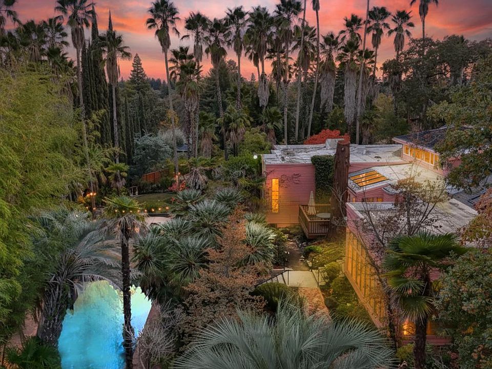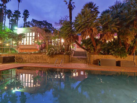 Sparkling poolGated retreatPrivate park-like oasisCrown moldingsOpen floor planLush landscapingStained glass windows