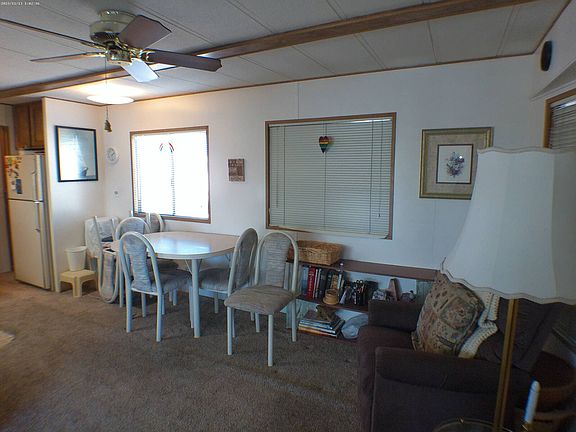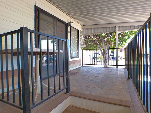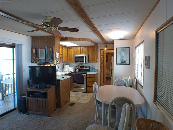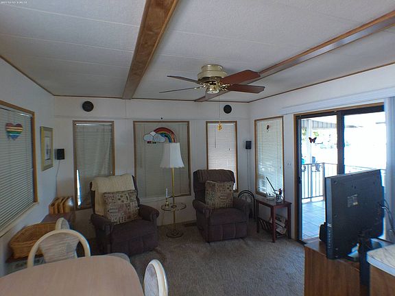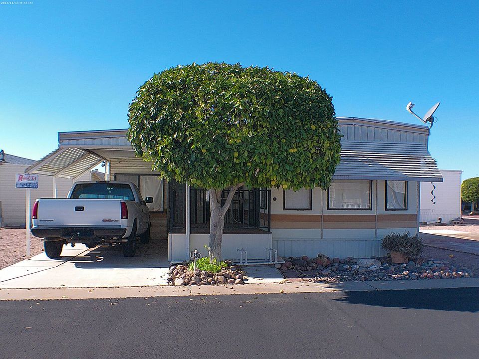 Located in a premier resort full of activities, this park model features raised tiled front deck for outdoor living. There are two sliding glass doors with screens. Living room with two recliners, ceiling fan, and a mix of carpet and laminate flooring. Kitchen features stainless steel Frigidaire Professional built-in microwave, dishwasher, and stove; deep Kohler sink with upgraded faucet and garbage disposal; built-in knife rack; laminate countertops; and plenty of cabinet storage. Large bathroom with Step-in shower, with built-in drawers, and a ceiling vent. Bedroom includes a queen-size bed (with room for a king), built-in dresser, mirrored closet doors, and a ceiling fan. Extra half bath with water-saving toilet and pocket doors. Finished Arizona room with textured walls and ceiling tiles, sofa sleeper, and a built-in shed offering additional storage, countertops, and a washer and dryer. Some items pictured may not convey. Lot rent is shown as monthly estimated that is due annually, in August of each year. Call today to view this home!