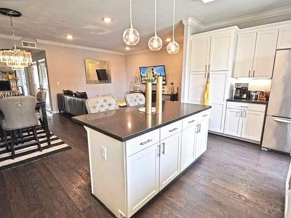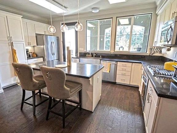 The kitchen has desirable features like stainless steel appliances, island, pendant lights, gas stove, pantry with ample storage, windows in the kitchen.