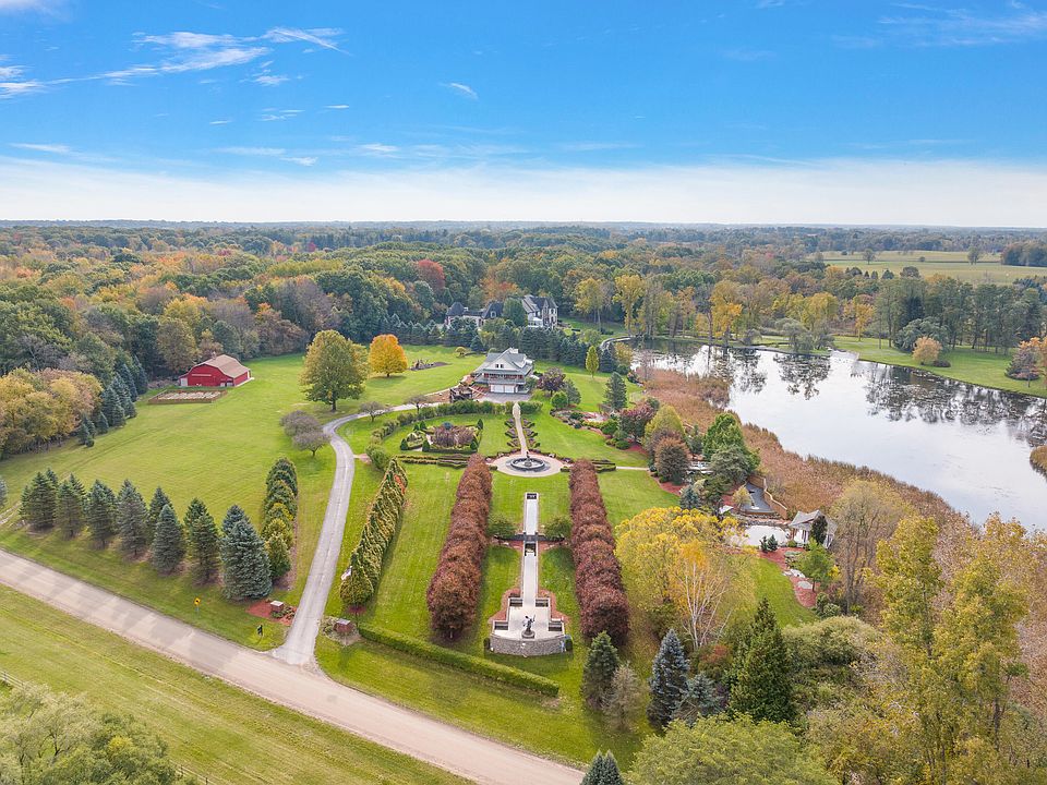 Welcome to a truly exceptional private estate on 10.13 acres in Bruce Township, showcasing a meticulously updated 5-bedroom, 3.5-bath residence with nearly 5,000 finished sq ft of living space, including a walkout lower level with second kitchen, family room, office, and three-season sunroom. The grounds are an oasis featuring a 180-ft reflection pool, Japanese-inspired streams, multiple waterfalls, extensive rockscaping, a semi-private lake. Architectural highlights include a two-story great room, first-floor primary suite, upper-level bridge walkway, gazebo, pole barn, and expansive Trex decking with panoramic views. Included in the sale are three original Jason Napier bronze sculptures valued at $210,400—offered at no cost to the buyer. A rare blend of art, architecture, and nature.