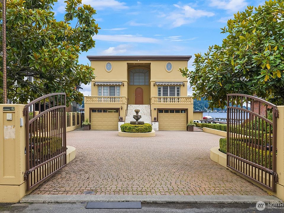 Exquisitely crafted w/modern European elegance, this multi-generational estate radiates golden warmth. A gated car pavilion for sophisticated living, anchored by Italian high-gloss cooking arena w/burnished copper hood beneath a reflective barreled ceiling. High-gloss + tumbled marbles, granite, terra cotta create luxurious interiors. Lower level features bedrooms w/Jack-and-Jill bath, functional kitchen, living space; main level offers soaring windows, gourmet kitchen, living area; upper level includes two primary suites w/spa baths and serene water views. Fully gated waterfront w/extraordinary frames of Lake Washington + Mt. Rainier. Deeded to LF Park Civic Club. Possible Sheridan Beach Club membership. Neighboring MLS# 2440346 for sale.