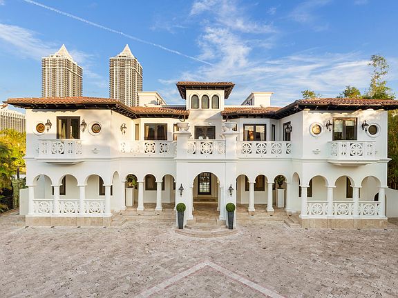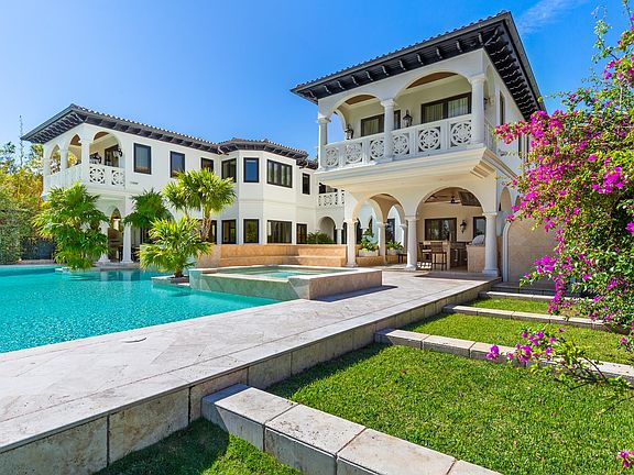 A magnificent gated estate - Villa Sole is designed for palatial living on Miami Beachs storied Pine Tree Drive, with views over Indian Creek and glimpses of the ocean beyond. On an oversized 44,000 square foot lot with 100 feet of water frontage, the 19,530 square foot home is rich in architectural details, including twin grand staircases, a stately great hall to rival any castle, intricate tilework and moldings, and stones from around the world. Unique features include a velvet-paneled home theater complete with miniature box office, a palatial master suite, two pools, a lighted tennis/basketball court, two guest apartments, a billiards room and bar, and a full hair salon.