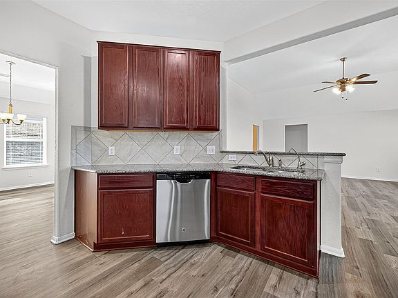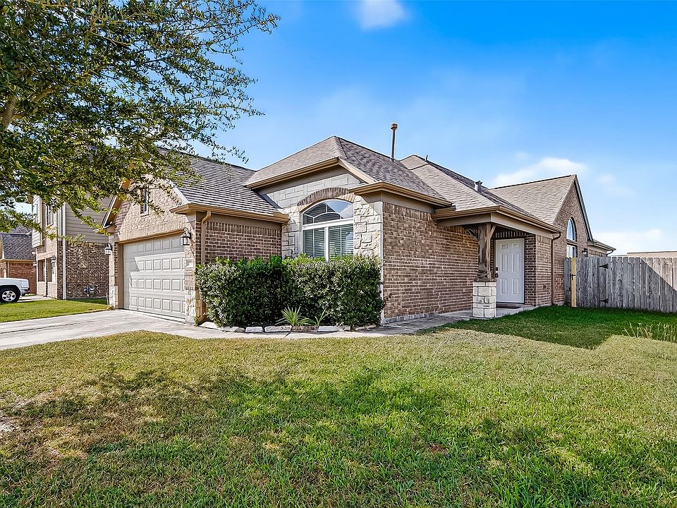 Welcome to this inviting Rosenberg home featuring a spacious living room that opens seamlessly to a modern kitchen with bar seating, perfect for entertaining or everyday living. The kitchen flows into the dining room, creating a bright and open layout for family meals or gatherings. The primary bedroom serves as a private retreat with an ensuite bath, complete with dual sinks, a vanity area, and a walk-in shower. Two additional bedrooms offer flexibility for a home office, guest space, or hobby room. Step outside to a fully fenced backyard, ideal for outdoor dining, play, or relaxing in privacy.