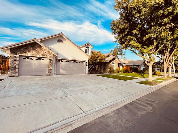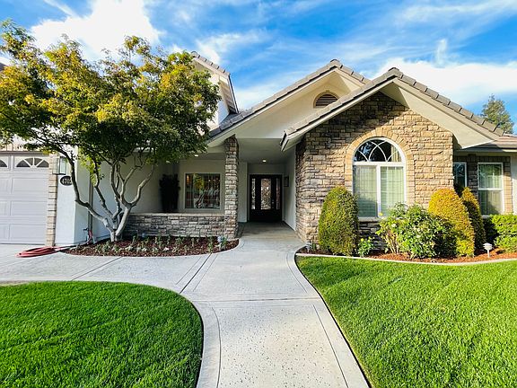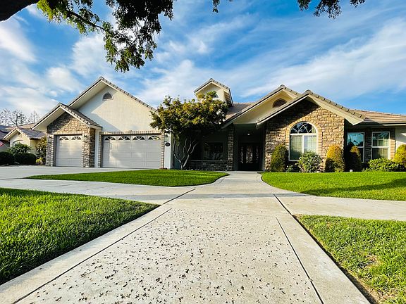 This beautiful custom home, located in Visalia's Cobblestone I gated community, is move in ready! 4 bedrooms, 2 bathrooms, 3 car garage with built in cabinets and a walk-in attic. Large Living room relaxing. Eat in Kitchen and a multi use room just off the kitchen that is a formal dining area but could be used as an office. The kitchen has double ovens, New built in refrigerator, 5 burner stove, granite countertops, island, and huge walk-in pantry. Throughout the home you will find surround sound installed - both inside and outside, 2 fireplaces, a large laundry room with sink. The split bedroom floor plan offers privacy. The primary bedroom is very spacious with jetted tub, double sinks and large walk in closet.