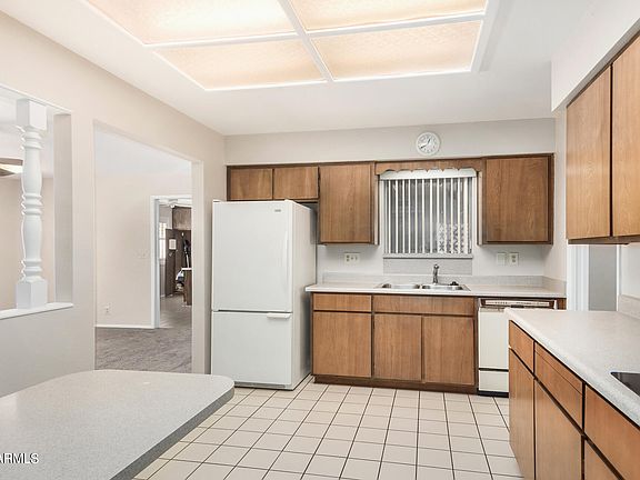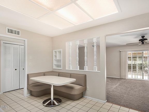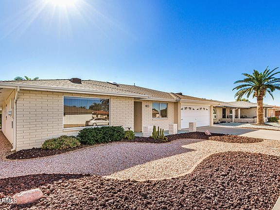 This lovely Model 800 home sits on very quiet interior lot in Sunland Village and has been nicely updated with new carpet and fresh 2-tone paint! The entryway welcomes you into this home with a formal living room and dining room on either side, allowing for privacy from the main living area. The kitchen has direct access to both the formal dining room and the family room and enjoys lots of natural light. The spacious mstr bdrm has a walk-in closet and dual vanities and a walk-in shower in the bathroom. The large guest bdrm has it's own private space and the guest bath includes a tub. In addition, the huge laundry room includes a desk area and extra storage and the garage has an additional storage area large enough to park a golf cart! The backyard offers a large covered patio and citrus!