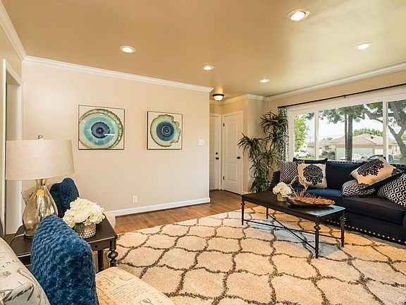 Great location for first time buyers on this move in ready home which is adjacent to a greenbelt with there being only one next-door neighbor, and situated on a tree-lined street in an inner-tract. The entryway has a guest coat closet and takes you into an airy living room with a large picture window and recessed lighting. Throughout the home, there is beautifully refinished hardwood oak flooring and crown and base moldings, plus tile flooring in the kitchen and fully upgraded bathroom. The adjacent formal dining room is steps away from a completely remodeled kitchen with stainless appliances, granite countertops, and gorgeous custom wood cabinets. The inside laundry room has a door leading out to a big fenced backyard and a large brick patio for al fresco dining. Additional amenities include a tankless water heater, a newer 30-year roof, and new dual pane energy efficient vinyl windows. Absolutely Turnkey!!