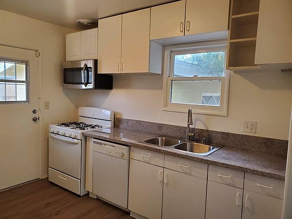 Stove, microwave, dishwasher, new plank floors, new paint, single car garage, front & back yard (Tenant pays Elect, Gas, water, trash)