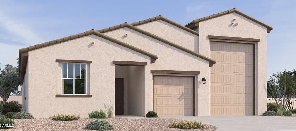 Welcome to your Dream Single-Story RV Garage Home! This Ruby RV Garage brand-new construction home plan boasts Arizona's classic desert architecture in the front, blending seamlessly with its surroundings. With 2,178 square feet of designer-curated living space, this gem offers a place of casual comforts and airy style. The spacious open-concept floor plan has three bedrooms, a large den, and 2.5 bathrooms. You'll love the magnificent four-panel center siding glass door, bathing the area in sunlight, and the Lakewood Vista 7 x 22 Plank Tile wood-look floors throughout the main living areas, offering elegance and easy maintenance. A chef's delight, the kitchen delivers in every way with White Ivory Quartz countertops, a stainless steel single bowl under-mount sink, a stainless steel single bowl under-mount sink, a stainless steel Gas range, a large island, Baker Blvd Herringbone tile backsplash, and Fairview white 42" upper cabinets with satin nickel cabinet hardware. This oasis home also has a 2-car tandem garage plus an RV Garage to store your big toys, classic cars, and so much more. The possibilities are endless. The Amarillo Creek community is conveniently located near Route 347, which makes it easy to commute to Phoenix, Chandler, and Mesa. It is just minutes away from Maricopa's array of dining, shopping, and entertainment options.