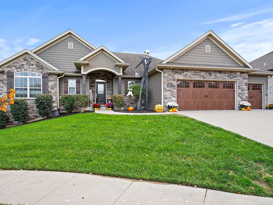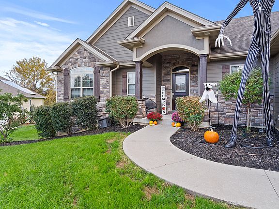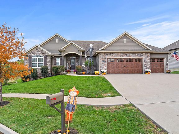 Welcome to this stunning 5-bedroom, 3-bath ranch home in the desirable Bellwood subdivision! Built in 2017 by Hansman Homes, this spacious property offers over 3,000 finished square feet, a split-bedroom layout, and a bright, open main level perfect for everyday living and entertaining. The kitchen features granite countertops, a gas range, custom wood cabinetry, pantry, and a large island overlooking the living room with a stone gas fireplace.