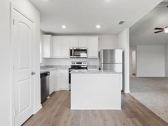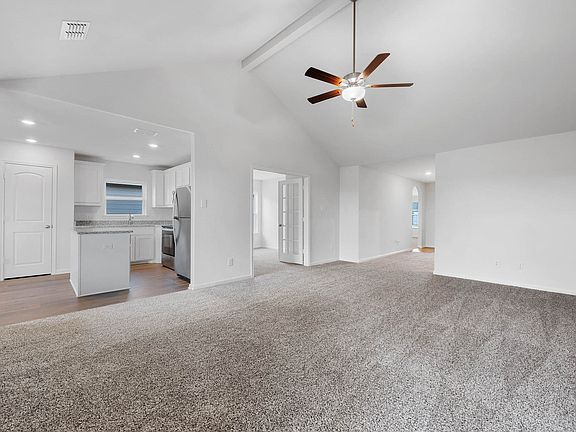 This thoughtfully designed, open-concept layout is perfect for family living with the kitchen comfortably nestled in-between the living room and dining room. In the kitchen, you will find a highly-coveted island with beautiful granite countertops and wood cabinets. At the heart of the home, sits the large family room with vaulted ceilings, which is a great space to relax with friends and family. The additional flex room is the extra space you never knew you needed whether you would like it to be a game room, movie room or office. The covered back patio and fenced-in yard is a perfect space for children and pets to run and play! Other thoughtful details included in this home is front yard landscaping, walk-in closets in every bedroom, and an attached two-car garage with a Wi-Fi-enabled opener and more! This home is right off Hwy 69 with easy access to dining, shopping and nearby employers.