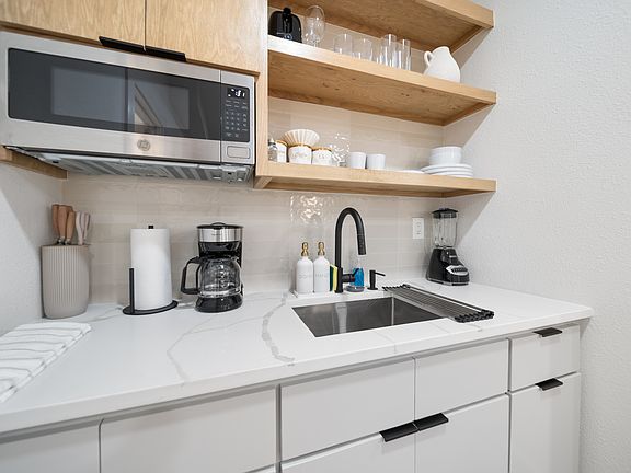 High ceilingsStainless steel appliancesQuartz countertopsNatural lightAmple cabinet space