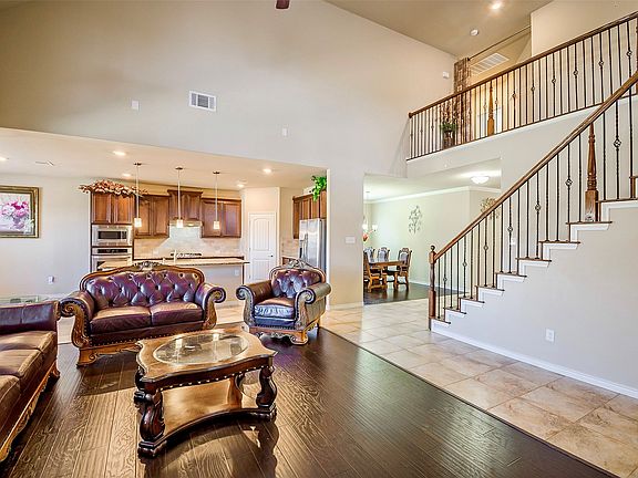 This beautifully maintained residence perfectly blends modern comfort with timeless style. From the moment you arrive, the meticulously manicured landscaping and tranquil front porch create an inviting first impression. Inside, elegant details shine throughout — from the graceful iron stair railing to the light wood-grain tile flooring and designer finishes. The thoughtfully designed layout accommodates all lifestyles, featuring two bedrooms on the first floor, including a spacious primary suite with a luxurious ensuite bath and large walk-in closet — ideal for convenience and privacy. The heart of the home is the stunning kitchen, showcasing premium cabinetry, a marble backsplash, and an island with seating. The kitchen flows seamlessly into the breakfast area, large dining room, and open living room — perfect for entertaining or everyday living. Upstairs, you’ll find two additional bedrooms, plus a versatile media room and game room, offering plenty of space for relaxation and fun. Step outside to a spacious, beautifully landscaped backyard with festoon lighting and a covered patio — a perfect retreat for gatherings or quiet evenings under the stars. Recent updates add even more value and peace of mind, including a new roof installed in November 2025 and Ring security cameras thoughtfully placed around the home. Located near Lake Ray Hubbard, this home provides easy access to dining, shopping, recreation, and major highways, including PGBT and I-30 — making commuting a breeze. This residence radiates pride of ownership and is sure to captivate even the most discerning buyers. See it today — and prepare to fall in love!