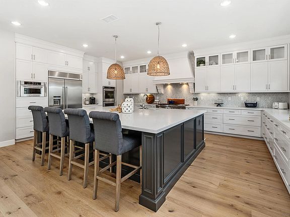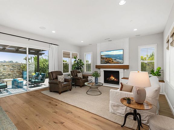 Discover this stunning Toll Brothers masterpiece, nestled in the exclusive, gated community of The Terraces in Robertson Ranch. This luxurious residence, situated at the end of a tranquil cul-de-sac, offers breathtaking canyon views and unparalleled privacy. With over 4400 sq. ft. of living space & 5 bedrooms & 5 ½ baths, this home is not to be missed. Step inside to an expansive open floor plan, where soaring ceilings and abundant natural light create an inviting and airy atmosphere. The home boasts new white oak hardwood floors throughout. The newly remodeled kitchen is a chef’s dream, featuring a sprawling island, built-in refrigerator, dual ovens, and chic pendant lighting. Seamlessly flowing into the family room with a fireplace, this space is perfect for both entertaining and everyday living. On the main floor, you'll find a guest bedroom with an ensuite bathroom and a dedicated office with exquisite walnut built-in cabinetry. The courtyard provides a serene spot for casual outdoor gatherings. Upstairs, a large bonus room complements four additional bedrooms, each with an ensuite bathroom. The luxurious primary suite offers spectacular views, a beautiful bathroom with dual vanities, a makeup vanity, a soaking tub, and a spacious walk-in closet. The backyard features a firepit, water feature, putting green, a relaxing spa, and seating area under a trellis, ideal for sunset views and relaxation. Additional highlights include surround sound, zoned A/C, and a 2 car garage. Experience the epitome of resort style