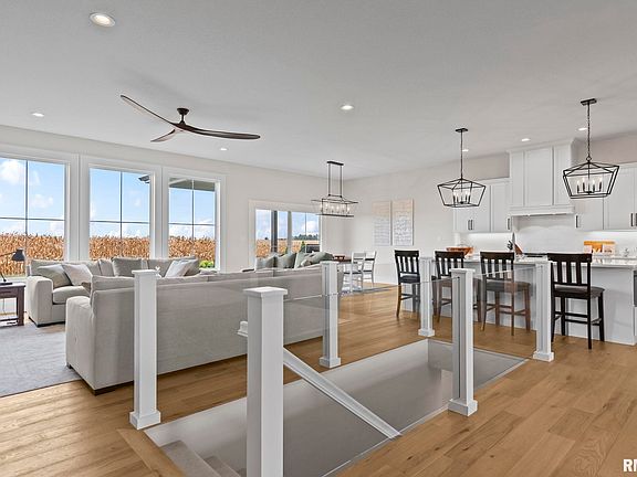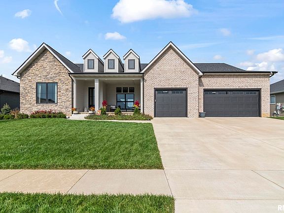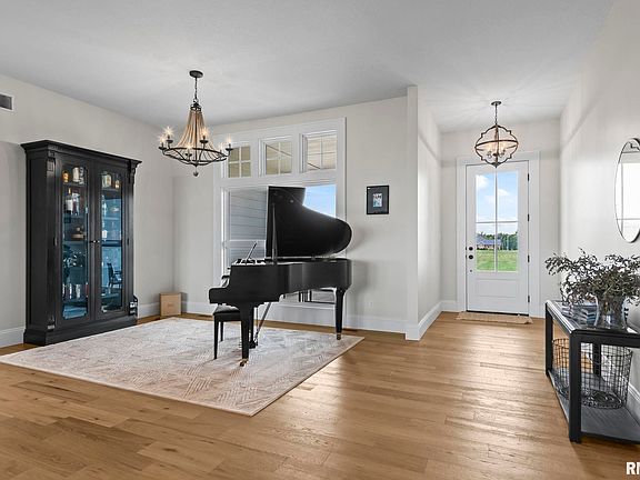 Welcome to this exquisite 4 bedroom, 3.5 bath ranch in the highly sought-after Savannah Point subdivision within the Chatham School District. Built in 2022 and backing to open fields, this home offers exceptional privacy, modern luxury, and timeless design. Step inside to discover elevated ceilings throughout, enhancing the open-concept layout ideal for both everyday living and entertaining. The spacious living room showcases custom built-ins and white oak hardwood floors flowing through the main living areas. The chef’s kitchen is a showstopper, featuring crisp white cabinetry, a large quartz island, and premium finishes. Conveniently located off the 3-car garage, you’ll find a stylish drop zone and a beautifully appointed laundry room with quartz counters, a utility sink, and ample cabinetry. The main level offers four bedrooms, including a luxurious primary suite with a spa-inspired bath, plus an additional en-suite bedroom perfect for guests or multi-generational living. A striking glass-paneled staircase leads to a massive unfinished lower level ready for your custom design. Enjoy outdoor living on the covered back porch overlooking the irrigated, landscaped yard. With high-efficiency HVAC, EV charger outlet in garage (2023), modern lighting, and exceptional craftsmanship, this home combines elegance, comfort, and thoughtful design in one remarkable package.