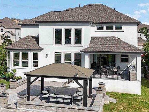 **Seller offering $20K towards Rate Buydown: Starting rate as low as 4% for Qualified Buyers** OPEN HOUSE SUNDAY 2PM-5PM Experience luxury in this stunning 5-bedroom, 4.5-bath Taylor Morrison home featuring the largest available floor plan for the Sapphire model in Travisso. The tall glass front door welcomes you into an elegant foyer leading to a formal dining room with a tray ceiling, a private office, and a guest bath. With an EAST-FACING FRONT and WEST-FACING backyard, abundant natural light flows through the home from sunrise to sunset, illuminating the soaring ceilings, custom fireplace, and expansive views in the living room connected to a gourmet kitchen with quartz countertops, shaker cabinetry with crown molding, a center island with a MotionSense faucet, a water softener, a walk-in pantry, and sleek appliances. The spacious primary suite offers bay windows with serene greenbelt views, a tray ceiling, a spa-like bath with a soaking tub, a walk-in shower with bench, and walk-in closets with custom built-ins. The main level also features a private in-law suite with its own full bathroom, perfect for multigenerational living. Upstairs includes a versatile game and media room with a home theater setup and three spacious bedrooms, one with a private bathroom and two connected by a Jack-and-Jill layout. Enjoy seamless indoor-outdoor living with a sliding glass door leading to an extended covered patio, a fully equipped outdoor kitchen, and a spacious 25-seat gazebo with LED lighting. The landscaped backyard features privacy shrubs and irrigation, an ideal setup for grilling and unwinding under the stars with your favorite music. Highlights include a 2-car garage with EV charger and mudroom bench, a glass-inset garage door, Astoria architectural lighting, matte black designer fixtures throughout, and a pre-wired security system. Enjoy resort-style amenities including pools, sports courts, and more.