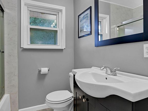 The kitchen has been recently renovated with white quartz countertops, updated soft-close cabinetry, and a brand-new dishwasher. The primary bedroom includes an attached half bath for added convenience, while two additional bedrooms and a full bath complete the main level.