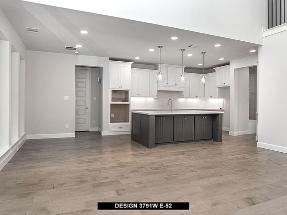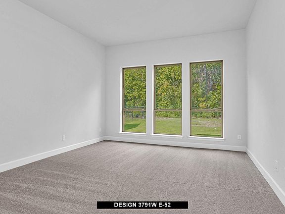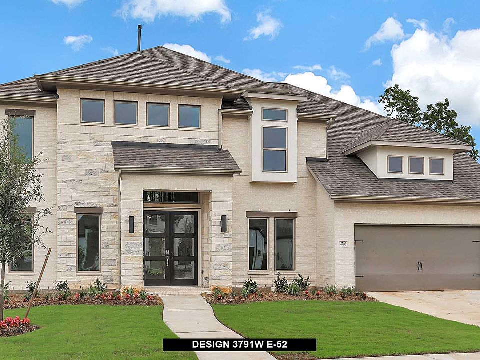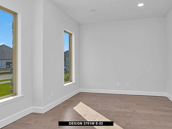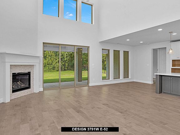 Curved staircase highlights two-story entry. Hardwood floors throughout living areas. Home office with French doors and formal dining room set at entry. Two-story family room with a sliding glass door and wood mantel fireplace opens to kitchen and morning area. Kitchen features walk-in pantry, 5-burner gas cooktop and island with built-in seating space. First-floor primary suite with wall of windows. Dual vanities, garden tub, separate glass-enclosed shower and two walk-in closets in primary bath. First-floor guest suite offers private bath. A game room, media room and three secondary bedrooms are upstairs. Extended covered backyard patio. Three-car garage.