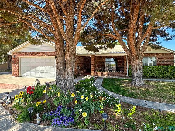 You feel like you are walking into a brand-new home when you enter this gorgeous property! Home is polysteel construction-R50 insulation in walls, R30 ceiling insulation, brick exterior, double insulated aluminum windows, cathedral ceilings, banco seat, open and split floor plan, primary suite with gorgeous primary bath, gorgeous landscaping front and back, glassed in private sunroom with heat/cool, covered front and back porches, cobbled concrete driveway and sidewalk, RV covered parking with concrete flooring, huge workshop, designated garden area and private fenced backyard with double gate in alley for easy access to backyard. Everything is ready for you.