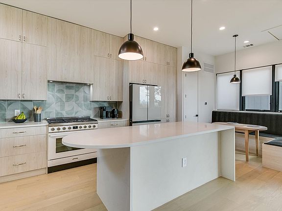 Contemporary homeLight hardwood floorsFloating shelvesBuilt-in workstationPremium appliancesSpacious banquette dining areaLarge center island