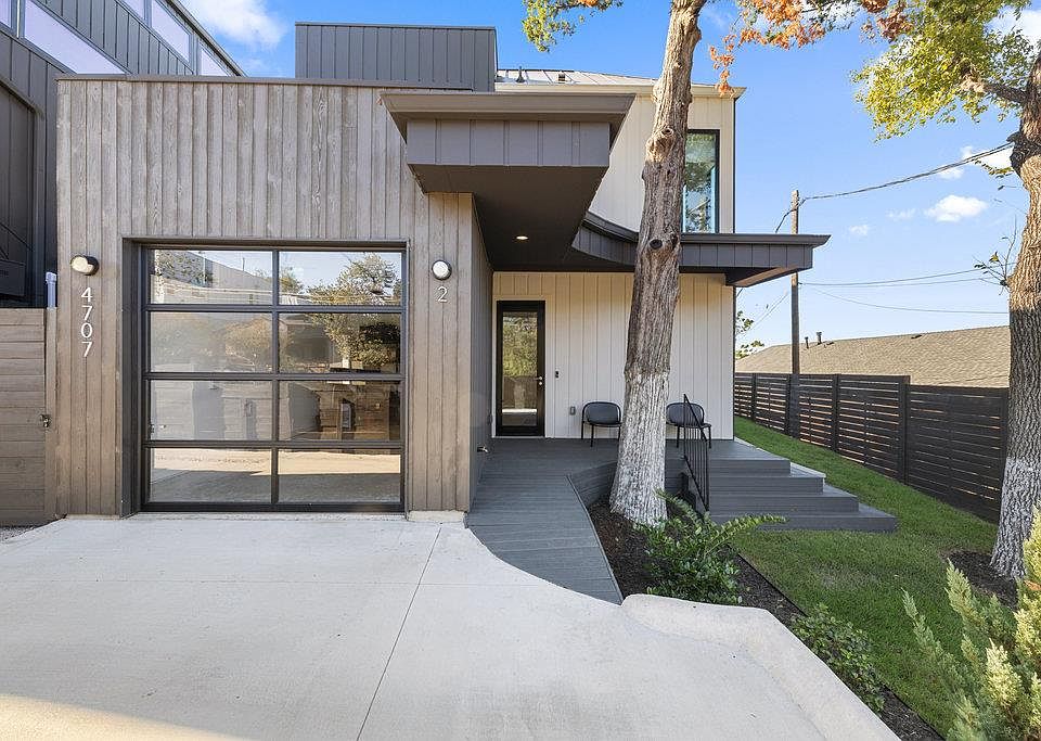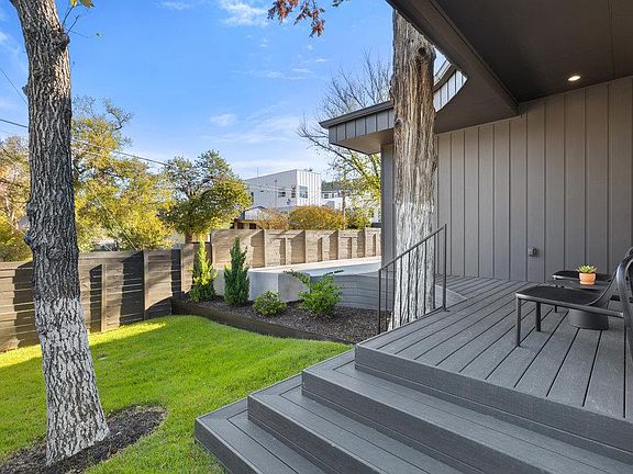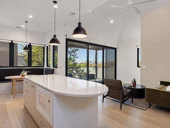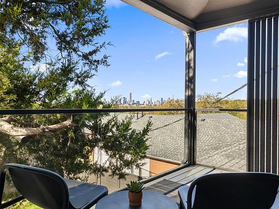 Authentic East Austin living with three standout features that are rare to find together: a full skyline view, a professionally designed interior, and private yard space, all within easy walking distance of some of the area’s best locally owned shops and restaurants. Designed by Pavonetti Architecture with interiors by BB Design, this home delivers 2025-quality construction with attention to light, layout, and views. Expansive picture and casement windows frame unobstructed city views, from sunsets to evening lights, while a glass panel balcony brings the skyline even closer. The elevated position and street-facing orientation provide privacy and allow for a usable yard, creating a flexible outdoor space that is uncommon in the area. The inverted floor plan is designed to maximize views and natural light. The main level includes two bedrooms and two baths. Upstairs, the open concept living, kitchen, and dining spaces feel bright and elevated, with vaulted ceilings and walls of glass that create a modern, airy atmosphere. Wideplank oak flooring, limewash walls, and designer tiles add warmth and character. The Scandinavian-inspired kitchen surrounds a large quartz island with seating, surrounded by full-height wood cabinetry, open shelving, and premium appliances, including a five-burner gas range. A built-in banquette defines the dining area and blends function with design. Additional features include energy-efficient systems, a standing seam metal roof, motorized window shades, and a one-car garage. The freestanding design and absence of HOA dues provide independence and flexibility. Walk to Springdale General- an arts community hosting non-profits, retail, art, and small businesses, and neighborhood favorites like Palomino Coffee, The Front Page Pub, Micklethwait Craft Meats, and Givens Park. With proximity to downtown, UT, Oracle, Tesla, and the tech corridor, this home combines skyline views, modern design, private outdoor space, and walkability in one package.