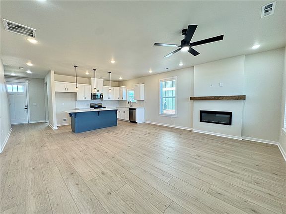 Fence, blinds and gutters included! Discover your dream home in the sought-after Osage Hills neighborhood. Emmet plan with garage on the right and West facing! 9 ft ceilings, linear electric fireplace in the living room, LVP flooring throughout the main living areas and primary bedroom, quartz countertops and more. Chef's kitchen boasting frigidaire stainless steel appliances, gas range, pantry, quartz countertops, bar pull handles and large island, all complemented by gorgeous backsplash. Luxurious primary bedroom features abundant natural light, while the spa-like primary bathroom offers a walk-in shower, tub, double sinks, and spacious walk-in closets. Additional features include a secondary bedroom downstairs, two large bedrooms upstairs and a separate laundry room. Nestled on a generous lot with covered patio that overlooks the serene sodded, fully fenced backyard. Sturdy concrete siding & brick! Model home located at 6008 SW Coywolf St- Lot 122.