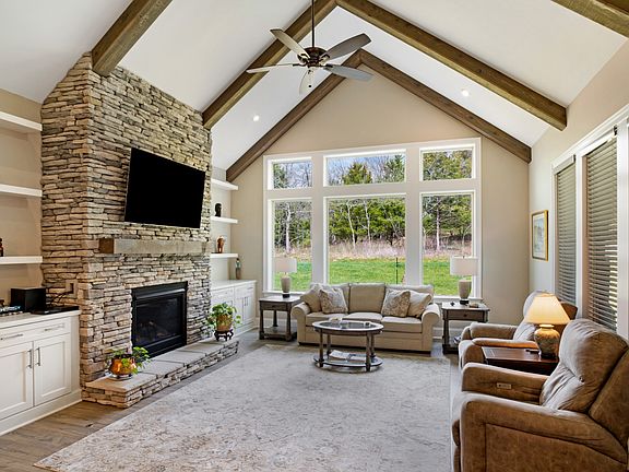 The inviting living room features a stunning fireplace, designer lighting, and built-in shelving, creating a warm and stylish focal point for everyday relaxation. The main level offers exceptional convenience with both the primary suite and a secondary bedroom located on the first floor.