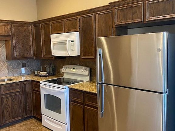 Modern Kitchen: Granite countertops, tile backsplash, and updated appliances (refrigerator, oven/stovetop combo, microwave, dishwasher).