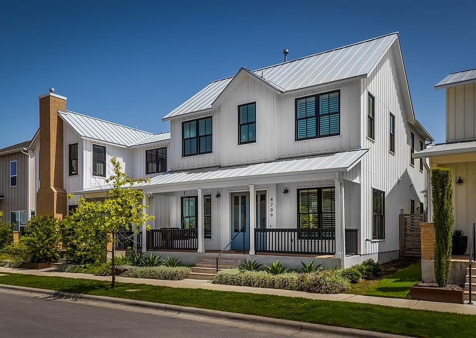 Exquisite farmhouse-style Mueller home designed by local architecture firm Clayton & Little. This 3 bed/2.5 bath home w 1/1 garage apt is all about the finishes. Herringbone brick patio & fireplace, white oak wood floors, plantation shutters & built-in entertainment center frame the living space. Quartz counters span the kitchen & butler's pantry. Luxuriate in the master suite w vaulted ceilings & finished w Carrara marble & free-standing tub. Truly walkable to all the neighborhood amenities.
