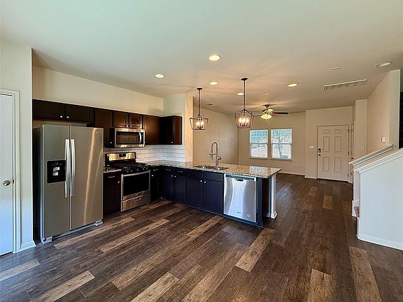 Stainless appliancesGranite counter topsFenced in backyardBlack cabinetsWood style floors