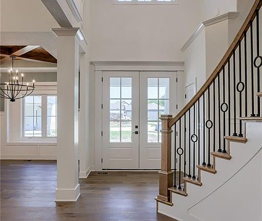 Unbelievable, thoughtfully crafted construction—this custom 1.5-story “The Rachel” plan offers 5 bedrooms and 3.1 baths with exceptional design, flow, and function throughout. Step inside to an instant WOW with a grand curved staircase, soaring two-story ceilings, rich wood floors, and beautiful stone and trim details—many features included here that others call upgrades. The vaulted great room showcases a stunning fireplace, while the spacious kitchen with a large, functional island is designed for gathering. The main-level primary suite features his-and-her walk-in closets and a spa-worthy bath with an oversized shower, freestanding tub, and double vanity. Expansive windows bring in natural light and overlook the covered deck and patio. Upstairs, four bedrooms surround a generous loft ideal for a second living area, game room, or office. The impressive lower level includes tall windows, a pre-stubbed bath, and endless potential for future finish. Don’t miss your chance to make this exceptional home your own!